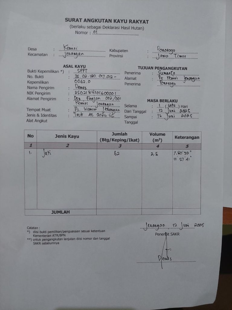 Pada bulan Juni 2025 ini ada penerbitan Surat Angkutan Kayu Rakyat (SAKR) di Kelompok Tani Hutan (KTH) Wono Mulyo Lestari Desa Kemiri Kecamatan Jenangan Kabupaten Ponorogo dengan jenis kayu adalah Jati dengan jumlah 62 batang dengan volume 3,5 M³.